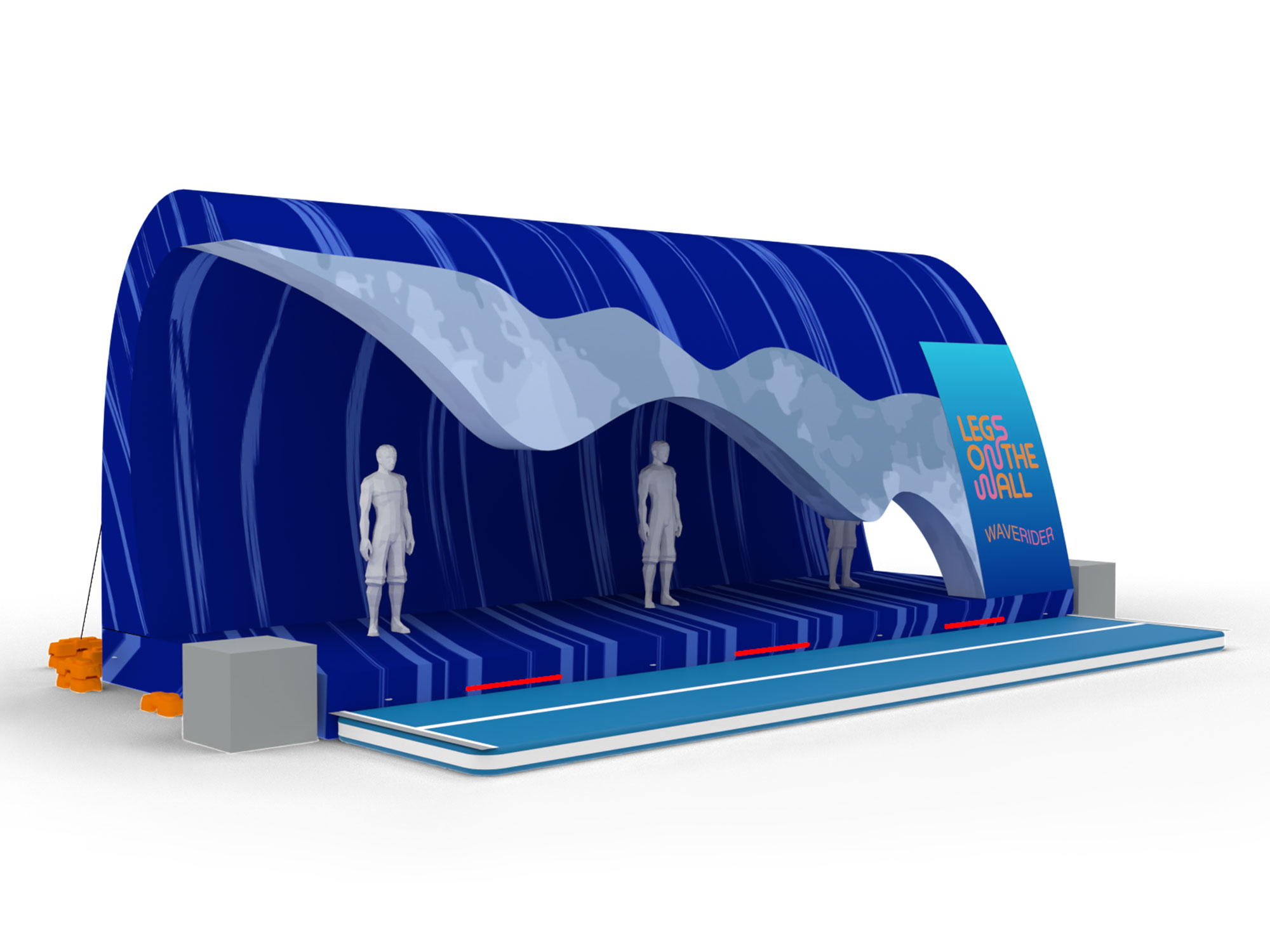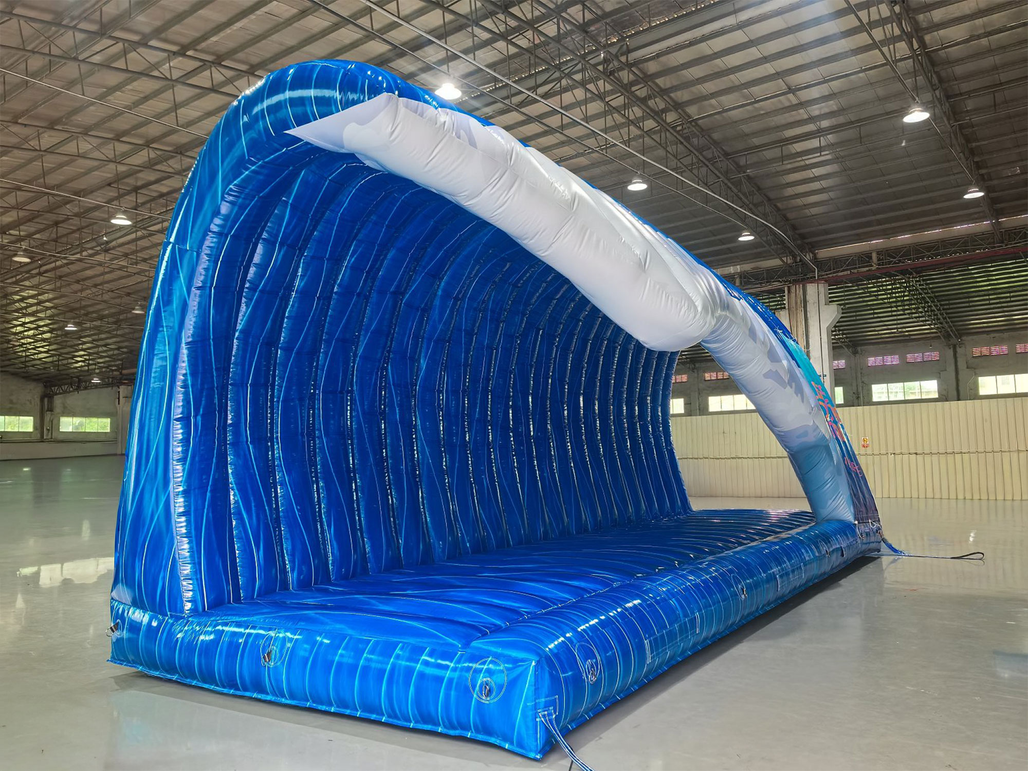 Setting up the inflatable wave is easy with high-powered blowers, so less labour is needed for assembly. Internal supports keep the wave’s arched shape without heavy frames. The inflatable wave packs down into a small pallet footprint for transport.
