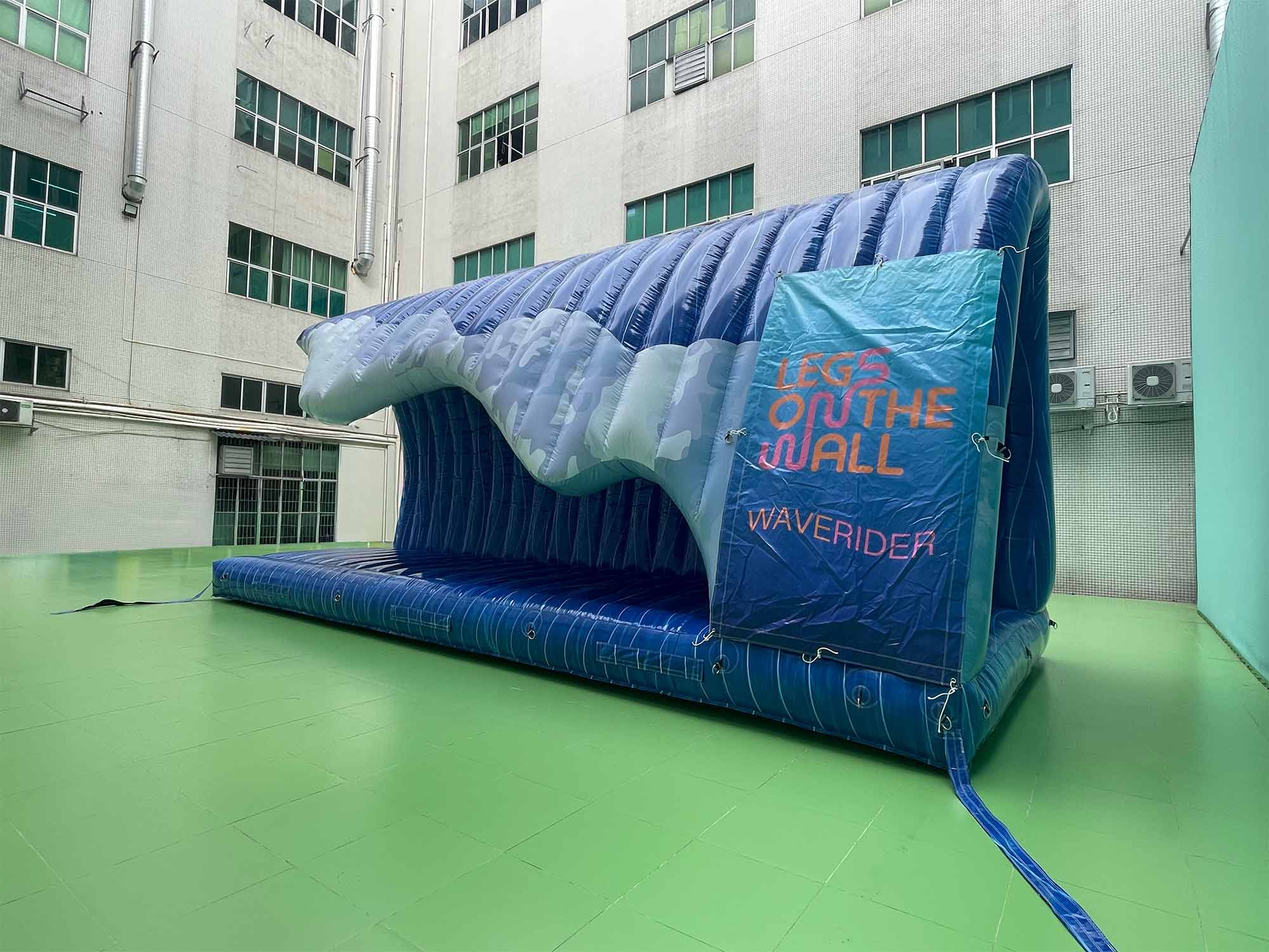 Legs On The Wall contacted Giant Inflatables to custom-design and fabricate a specialized custom inflatable wave. This custom inflatable wave serves as a lightweight and portable stage element that defines the performance space. By using a custom inflatable wave, the client achieved a grand visual scale that is easy to move between different tour locations. The custom inflatable wave allows performers to interact with a monumental structure that would be too heavy to build from traditional timber or steel.